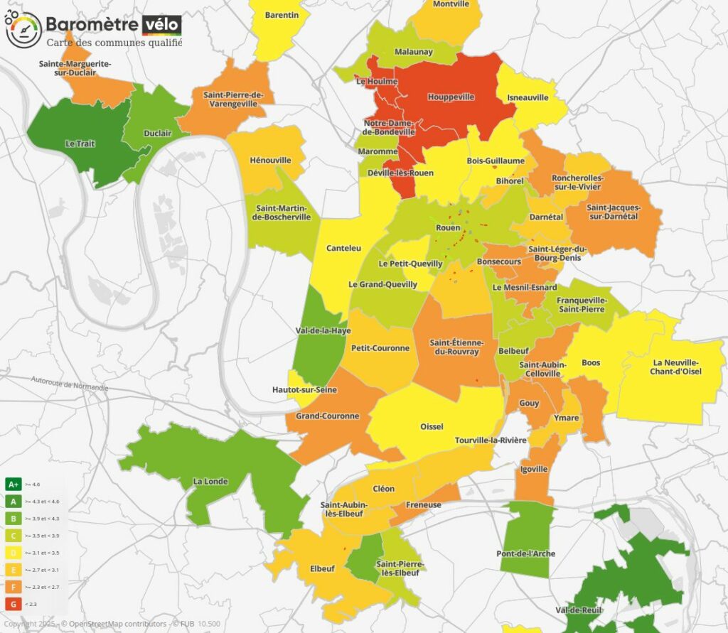 Le premier enseignement de l’édition du baromètre vélo 2025 est un fort engouement. En effet, alors qu’à l’échelle de la Métropole Rouen Normandie, l’édition 2021 avait reçu 2475 contributions permettant de classer 22 communes (une commune est classée si elle reçoit plus de 50 contributions, 30 pour les communes de moins de 5000 habitants), ce sont plus de 4200 contributions qui ont été reçues lors de l’édition 2025 avec 51 communes classées parmi les 71 que compte la Métropole. Cette augmentation révèle l’intérêt croissant de la population pour le vélo et renforce encore s’il en était besoin la portée des messages que véhicule cette enquête.