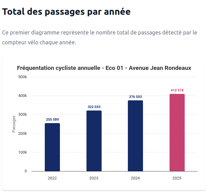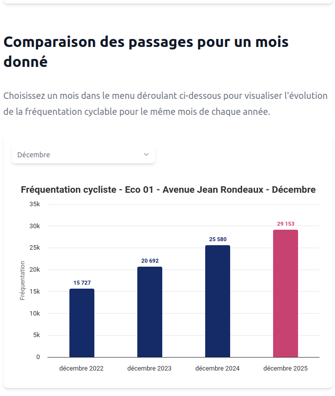 De façon annexe, la plateforme permet de suivre l’évolution de la fréquentation cyclable en exploitant les données des 29 compteurs vélo mise à disposition par le biais de l’opendata de la Métropole Rouen Normandie.